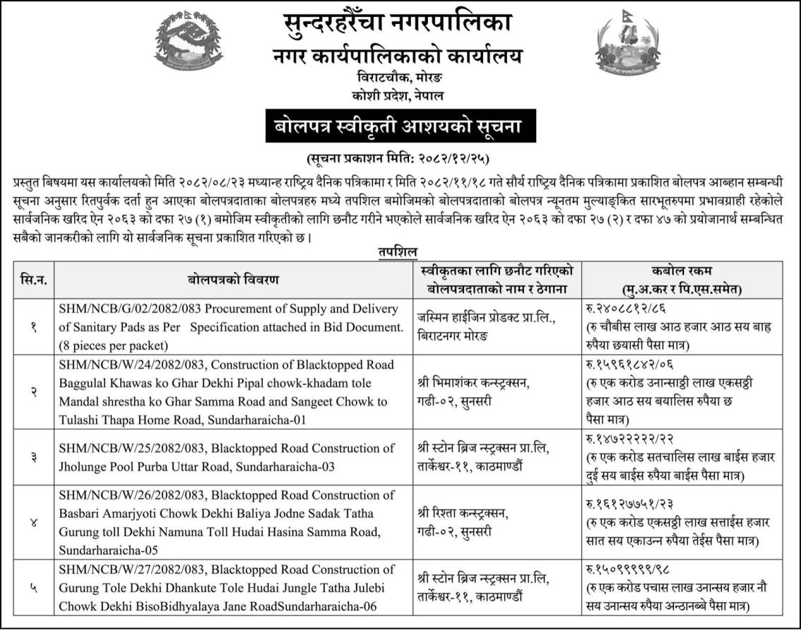 बोलपत्र स्वीकृत आशयको सूचना