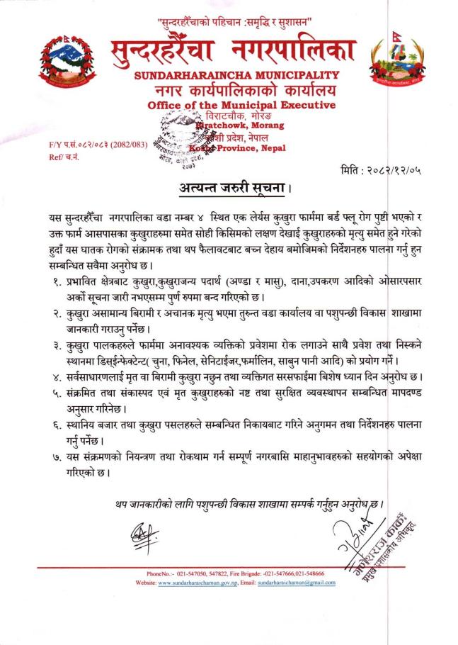 » लेयर्स कुखुरा फार्ममा बर्ड फ्लू देखीएकोले यो सूचना जारी गरीएको छ