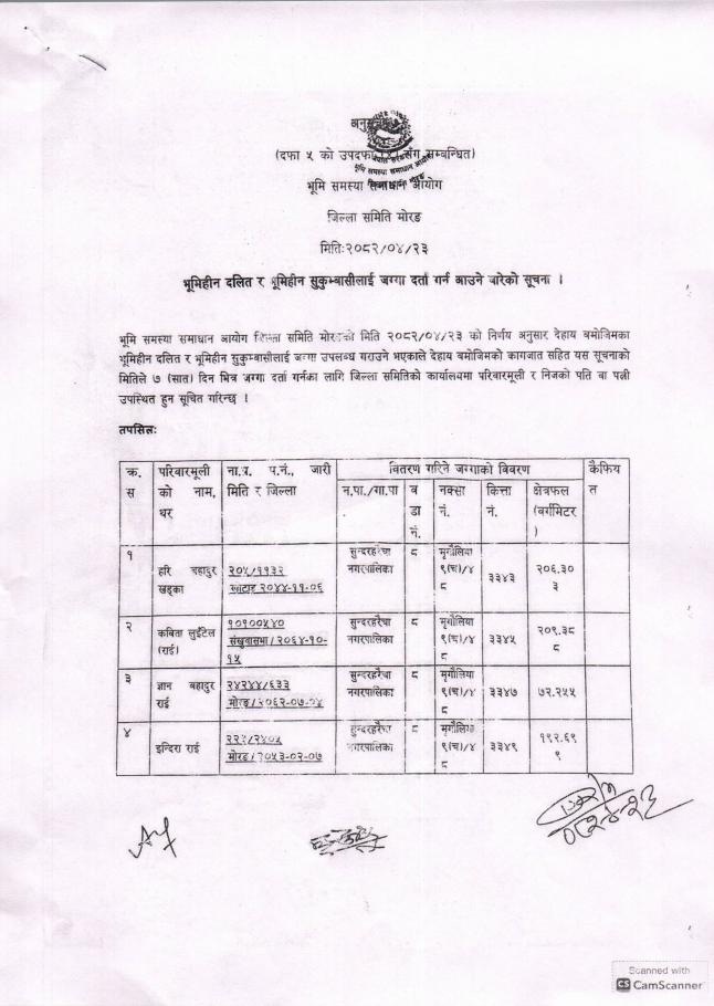 वडा नं. ८ को भूमिहीन दलित र भूमिहिन सुकुम्बासीलाई जग्गा दर्ता गर्न आउने बारेको सूचना