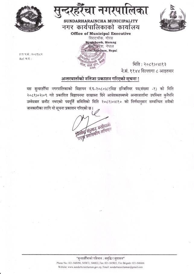 विज्ञ इन्जिनियर पदको अन्तरवार्ताको नतिजा प्रकाशन गरिएको सूचना !