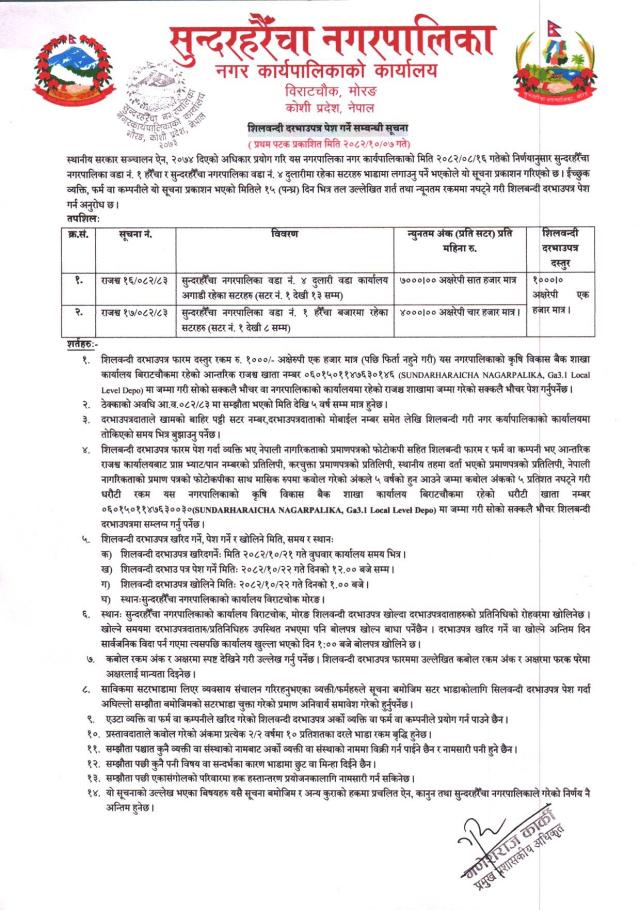 सटरहरु भाडामा लगाउनका लागि शिलबन्दी दरभाउपत्र पेश गर्ने सम्बन्धी सूचना