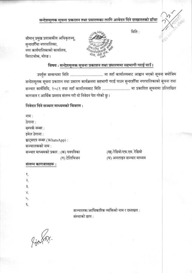 सन्देशमूलक सूचना उत्पादन, प्रकाशन वा प्रसारणको लागि आवेदन पेश गर्ने सम्बन्धी सूचना
