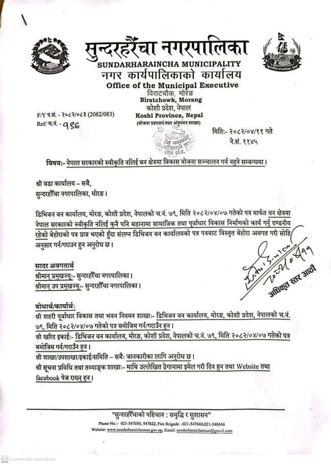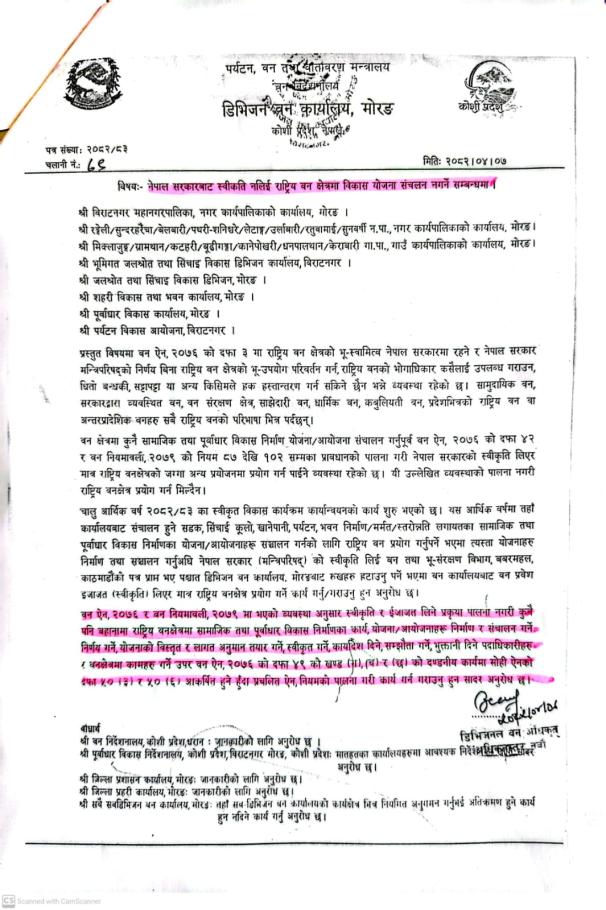 नेपाल सरकारको स्वीकृत नलिई बन क्षेत्रमा विकास योजना सञ्चालन गर्न नहुने सम्बन्धमा